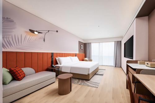 客房是旅居体验的核心。酒店拥有130间宽敞明亮的客房与套房,包含豪华套房、家庭房及无障碍房等多种房型。所有客房均配备65英寸智能电视、高速无线网络及静谧舒适的隔音设计。部分客房配备升降办公桌与沙发床,空间灵活多变。尤其值得一提的是,酒店于地面停车场配备了新能源充电桩,为自驾宾客提供贴心便利,全面覆盖油车与电车的出行需求。